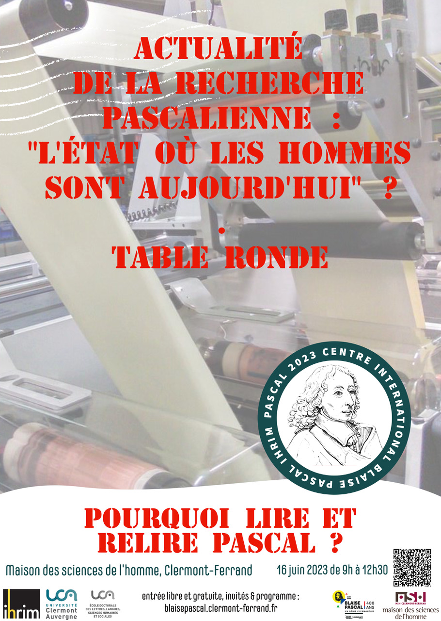 A l’occasion de la célébration du 4e centenaire de la naissance de Pascal, Laurence PLAZENET, professeur à l'Université Clermont Auvergne, directrice du Centre international Blaise Pascal de l’IHRIM, organise une table ronde intitulée Actualité de la recherche pascalienne : ? L’état où les hommes sont aujourd’hui ?. Elle se déroulera le 16 juin 2023, de 9h00 à 12h30, à la Maison des Sciences de l'Homme de Clermont-Ferrand (amphi 220).