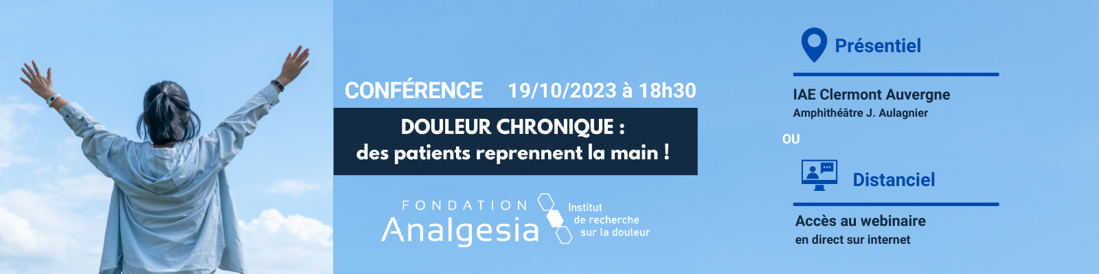 - Information et inscription : https://www.institut-analgesia.org/conference-douleur-chronique-les-patients-reprennent-la-main-19-10-23-a-18h30/