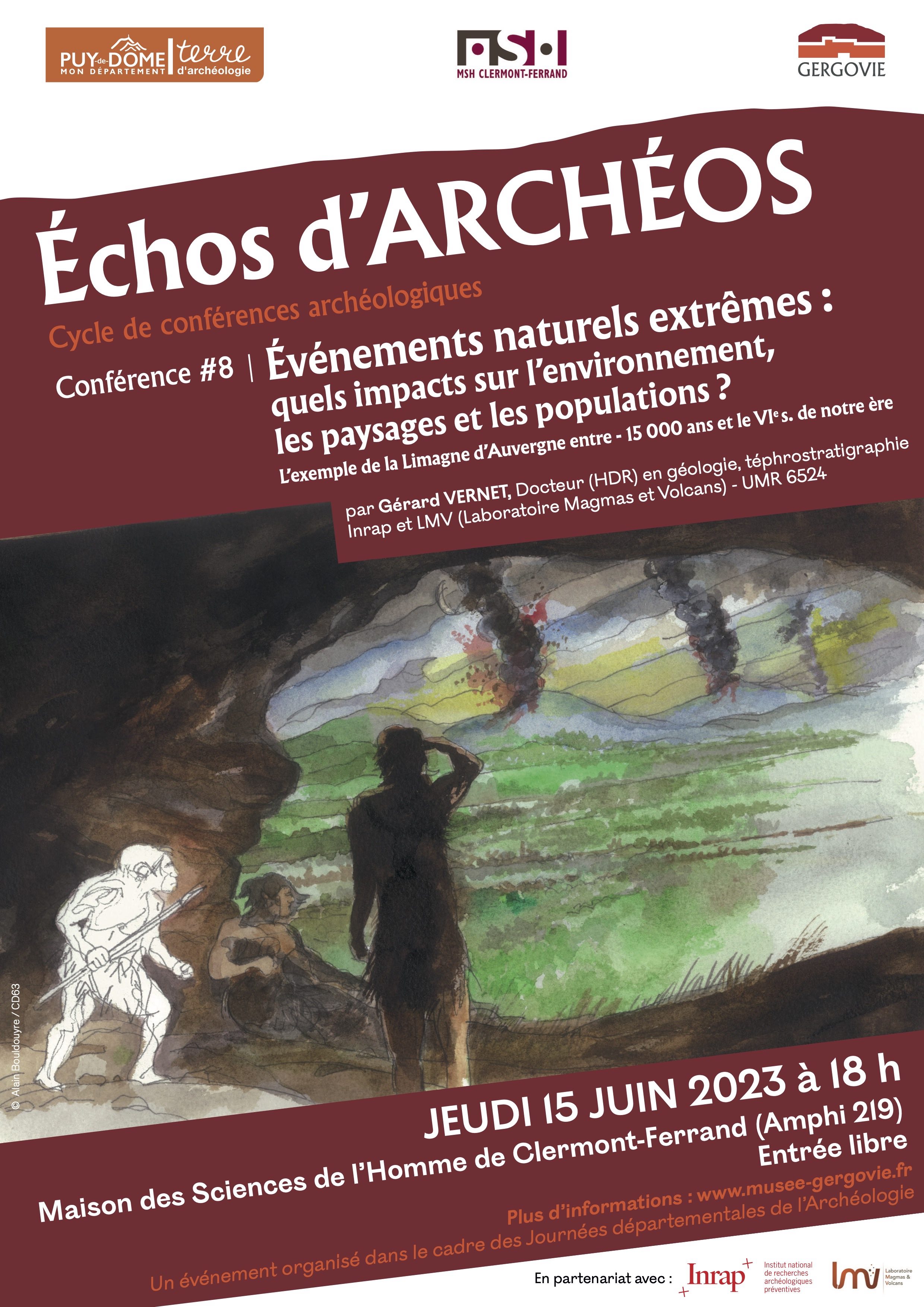 A l’occasion des Journées Européennes de l’Archéologie, le jeudi 15 juin 2023, à 18h00, à la Maison des Sciences de l'Homme de Clermont-Ferrand, amphi 219, Gérard Vernet, docteur (HDR) en géologie, téphrostratigraphie (Inrap/ Laboratoire Magmas et Volcans), présentera ? ?vénements naturels extrêmes : quels impacts sur l’environnement, les paysages et les populations ? L’exemple de la Limagne d’Auvergne entre - 15 000 ans et le VIe s. de notre ère ?.