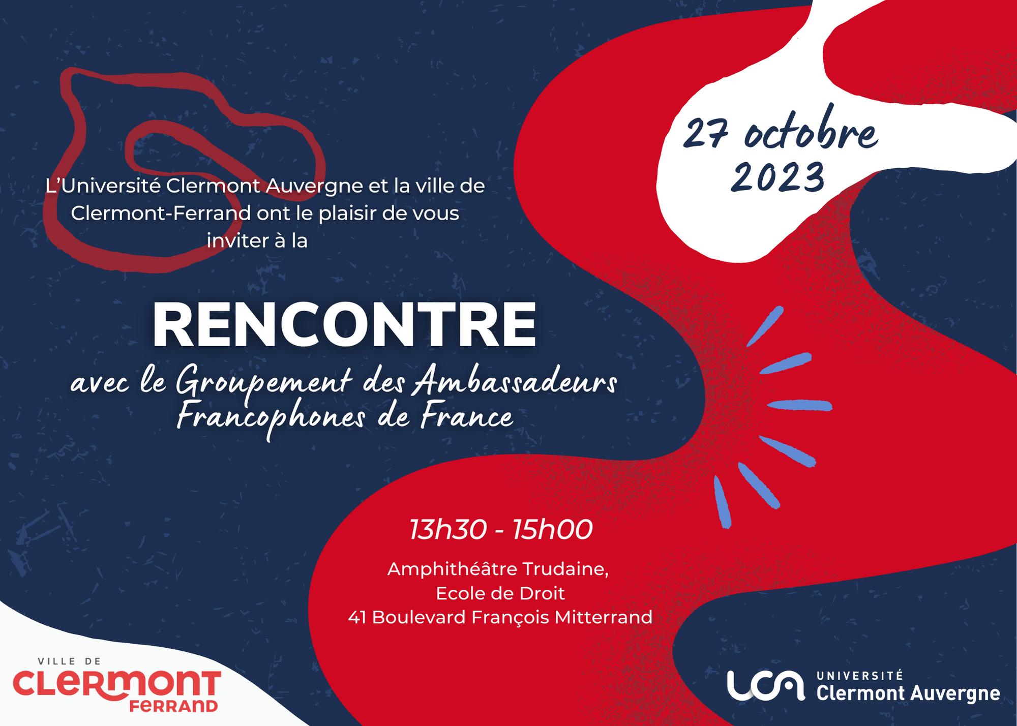 Dans le cadre d’une rencontre organisée par la Ville de Clermont-Ferrand et l’Université Clermont Auvergne, nous avons le plaisir d’accueillir vingt Ambassadeurs de pays étrangers en France, membres du Groupement des Ambassadeurs Francophones de France (GAFF), à l’amphithé?tre Trudaine, Ecole de droit, le vendredi 27 octobre 2023 de 13h30 à 15h00.