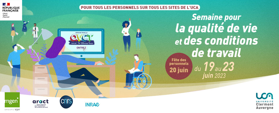 Durant 5 jours, l'ensemble des personnels travaillant à l'UCA (y compris les personnels INRAé et CNRS) pouvait s'inscrire afin de suivre les webinaires que l'Agence nationale pour l'amélioration des conditions de travail (Anact) proposait sur le thème "transition et travail". Pour voir ou revoir ces webinaires, les replays sont disponibles sur la page https://semaineqvct.anact.fr/
