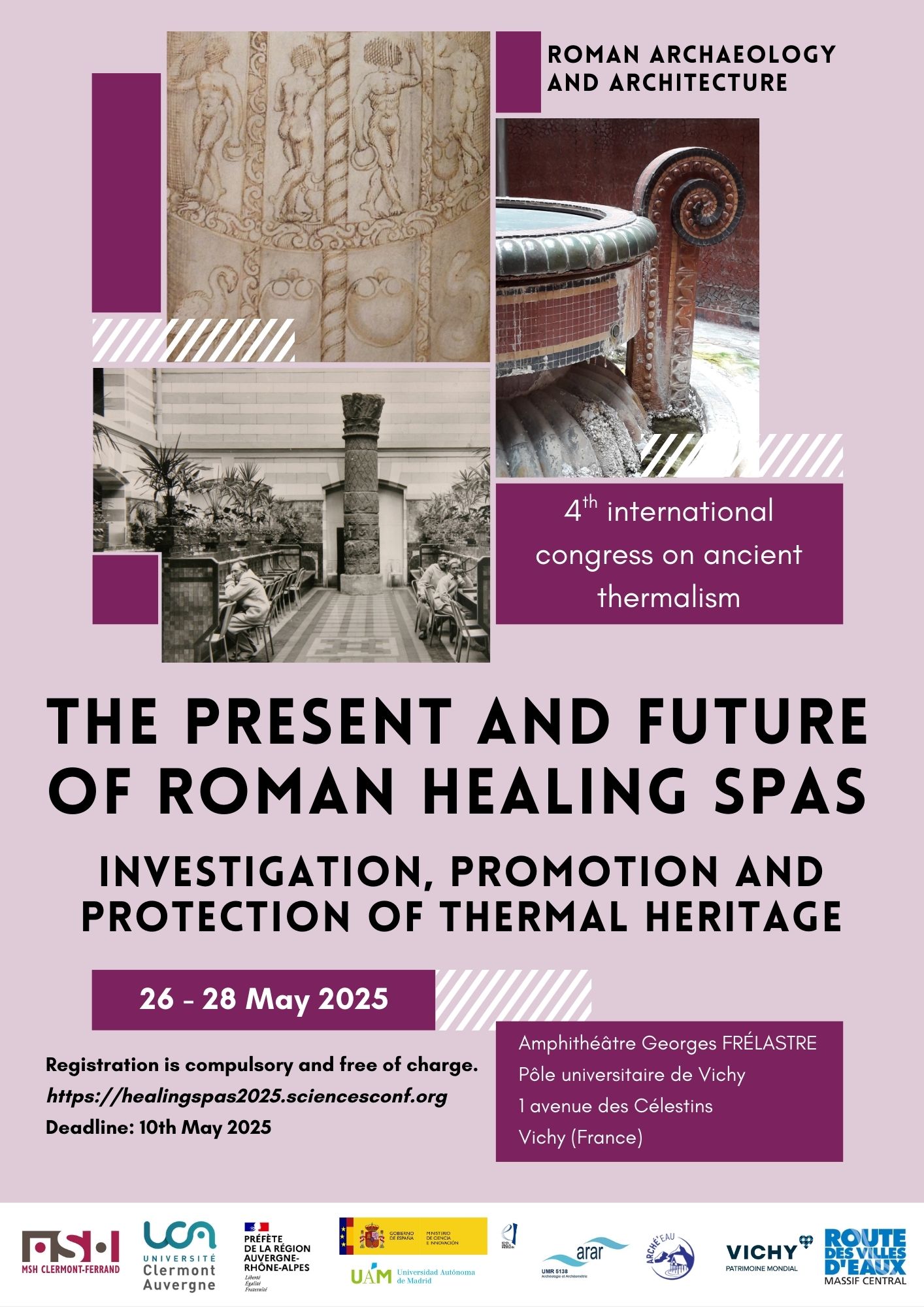 Le 4e congrès international sur le thermalisme antique ? The present and future of Roman healing spas: Investigation, promotion and protection of thermal heritage ?, organisé par la Maison des Sciences Humaines de Clermont-Ferrand, le Service régional de l’archéologie - DRAC Auvergne-Rh?ne-Alpes et l’Université autonome de Madrid, se tiendra du 26 au 28 mai 2025 au P?le universitaire de Vichy (amphithé?tre Georges Frélastre).