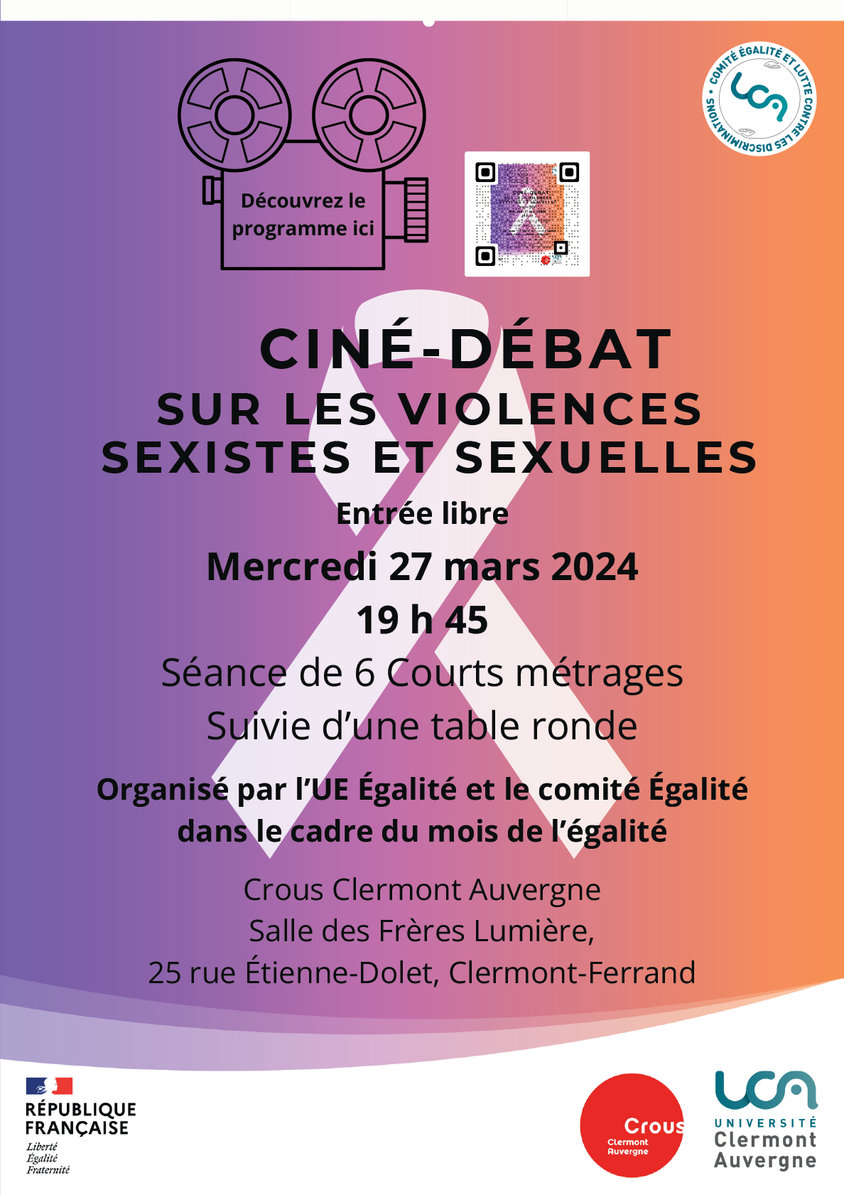 Séance de six courts métrages suivie d’une table ronde, organisée par l’UE Libre ?galité et le comité ?galité dans le cadre du mois de l’égalité. Entrée Libre et gratuite.