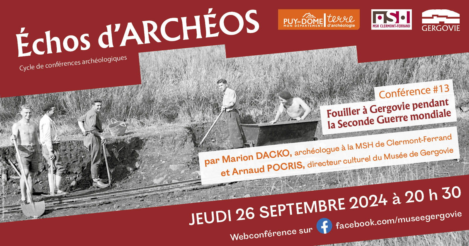 Jeudi 26 septembre 2024, à 20h30, sur Facebook, Page Musée de Gergovie, Marion Dacko, ingénieure de recherche en archéologie à la Maison des Sciences de l’Homme de Clermont-Ferrand (UAR 3550 UCA/CNRS), et Arnaud Pocris, directeur culturel du Musée Archéologique de la bataille de Gergovie, donneront une conférence intitulée : ? Les Gergoviotes. Fouiller à Gergovie pendant la Seconde Guerre mondiale ?.