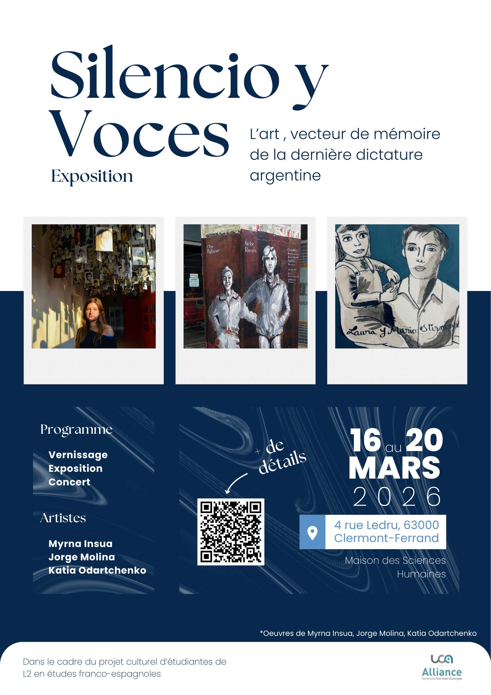 Elle réunit trois artistes sud-américains : Jorge Molina, un muraliste argentin, Myrna Insua, une photographe argentine, et Katia Odarchenko, une peintre uruguayenne. Ces trois artistes engagés avec trois styles différents témoignent des traces du passage de la dictature et des échos qui persistent.