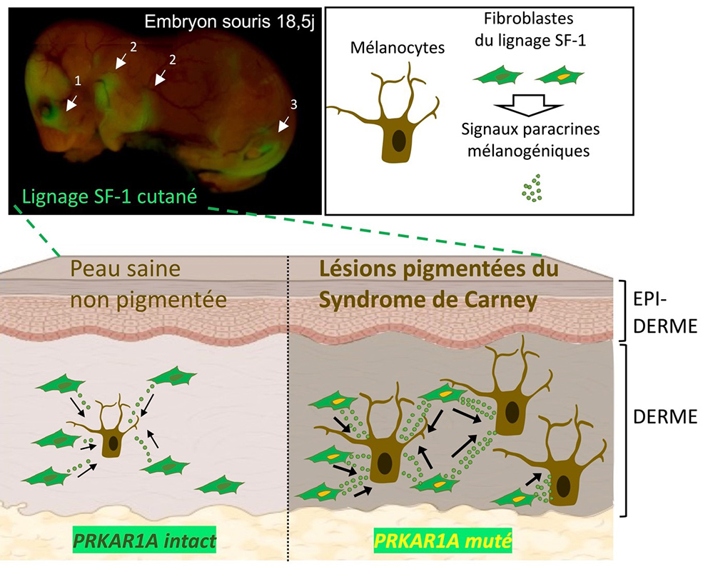 Ces travaux proposent pour la première fois une origine plausible aux lésions cutanées du CNC qui seraient le résultat d’une activité pro-mélanogénique excessive d’une nouvelle population de fibroblastes dermiques partageant des précurseurs embryonnaires communs avec les cellules stéro?dogènes. Enfin, ces populations cellulaires accompagnent le développement embryonnaire et périnatal des organes génitaux externes et de la glande mammaire, suggérant que dans un contexte physiologique elles pourraient participer à la maturation des fonctions de reproduction.