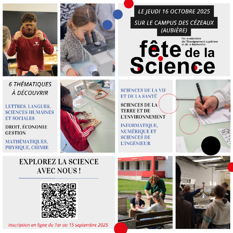 Cette année encore, l’Alliance UCA accueillera des élèves des collèges et des lycées de toute l’Académie pour 3 Villages des Sciences. Le jeudi 9 octobre 2025 sur les sites de Montlu?on (IUT) et Aurillac (IUT), et le jeudi 16 octobre 2025 sur le site d'Aubière (Cézeaux).