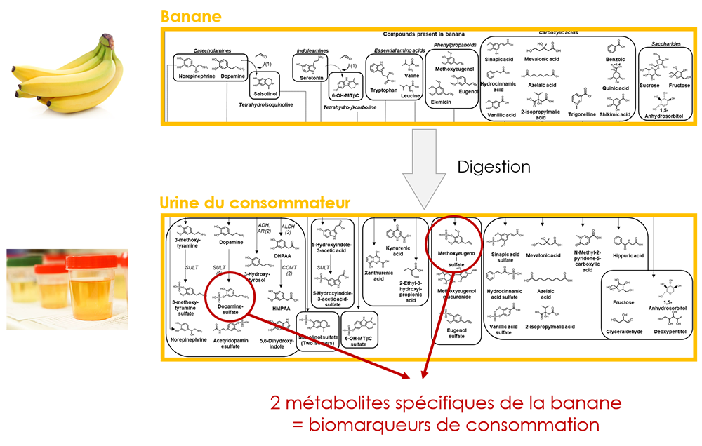 Avec l’exploration du ? food metabolome ? dans les fluides biologiques après consommation d’un aliment particulier, le reste de l’alimentation étant standardisé par ailleurs (repas pris sur le centre d’étude complétés par des recommandations précises pour les repas à domicile), on peut retrouver des molécules déjà connues pour cet aliment, mais aussi de nouvelles, soit encore inconnues soit inattendues dans l’échantillon. Dans le cas de la banane, un des 3 fruits les plus consommés au monde, nous avons ainsi pu identifier 33 de ses métabolites urinaires, certains dérivés des ar?mes du fruit, d’autres de molécules bioactives telles que la dopamine. Les informations recueillies peuvent aider à comprendre les effets de la consommation d’un aliment sur la santé, gr?ce aux connaissances sur la bioactivité des métabolites observés. Elles permettent aussi de déterminer des combinaisons de métabolites, ou signatures, qui peuvent refléter de manière spécifique la consommation de l’aliment en question.
