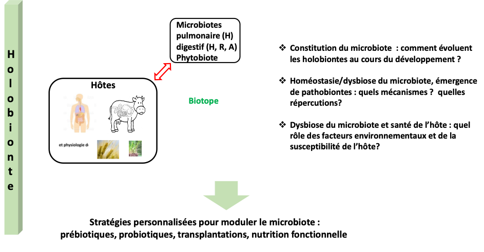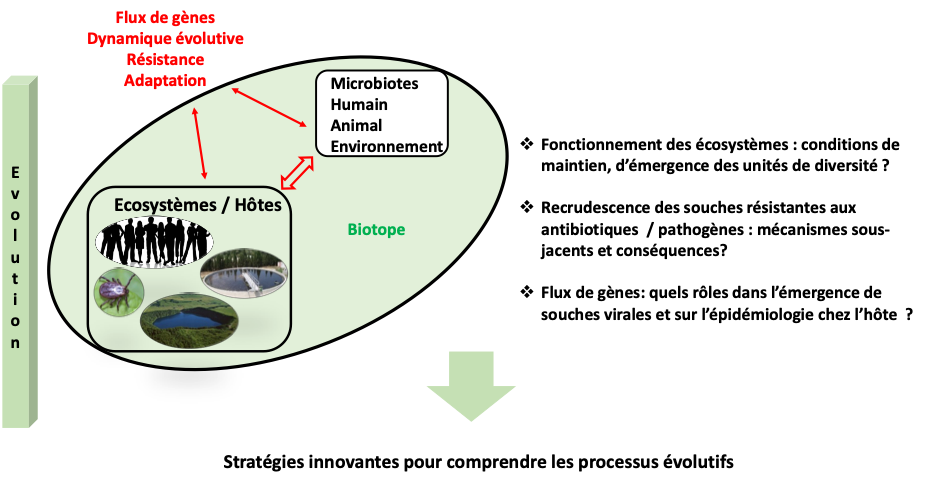 Les concepts et les technologies en lien avec la microbiologie évoluent sans cesse. C’est un défi majeur que de s’adapter à cette évolution, mais aussi de dépasser les approches monospécifiques et culturales pour intégrer des concepts nécessitant d’une part, une démarche interdisciplinaire et, d’autre part, une mutualisation des compétences et des outils innovants (métagénomique, métatranscriptomique, métaprotéomique, métabolomique, analyse des réseaux, modélisation…). Cette conception permet l’étude des interactions microbiennes omniprésentes à tous les niveaux d’intégration du vivant : molécules, gènes, génomes, organites, cellules, populations, communautés, microbiotes complexes en lien avec l’organisme h?te ou, le biotope dans les domaines de la nutrition, de la santé et de l’environnement.