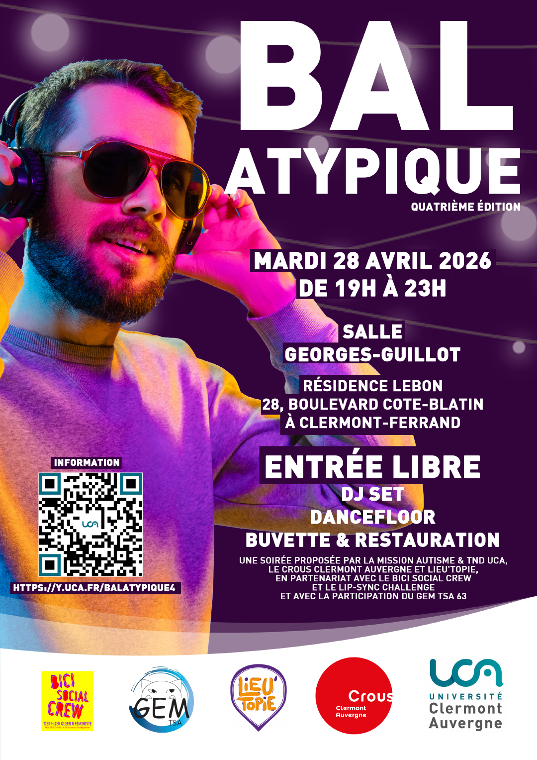 L’Université Clermont Auvergne annonce la tenue de la quatrième édition du Bal atypique, un événement festif, inclusif et légèrement décalé, prévu le mardi 28 avril 2026, de 19h à 23h. Ce bal se déroulera dans la salle Georges-Guillot, située au sein de la résidence universitaire Philippe-Lebon, au 28 boulevard Cote-Blatin à Clermont-Ferrand.