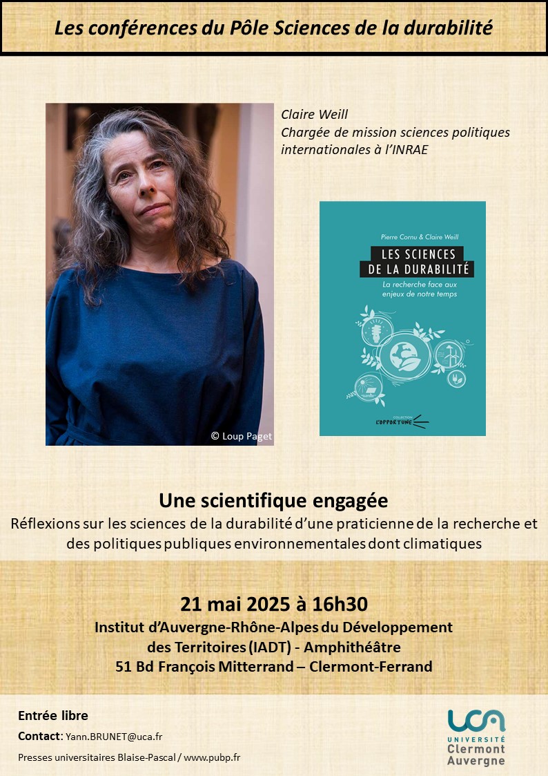? l'occasion de la parution de l'ouvrage Les sciences de la durabilité co-écrit avec l’historien Pierre Cornu ("L'Opportune"), le P?le Sciences de la durabilité a le plaisir d'accueillir le 21 mai à partir de 16h30 Claire Weill, chargée de mission sciences politiques internationales à l’INRAE, à l’amphithé?tre de l’Institut d’Auvergne-Rh?ne-Alpes du Développement des Territoires (IADT).