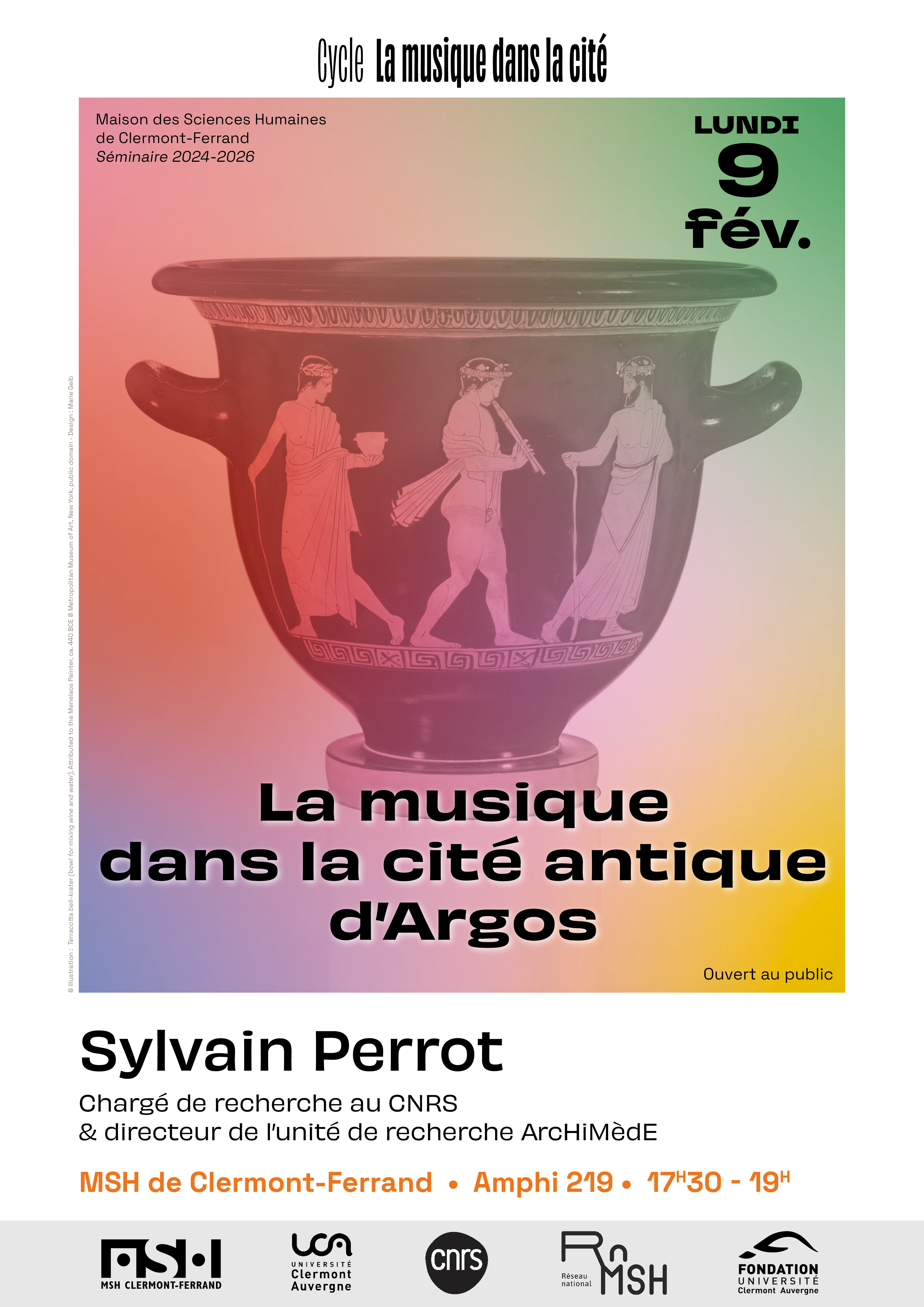 Sylvain Perrot, ancien élève de l’?cole Normale Supérieure de Paris, agrégé de lettres classiques et ancien membre scientifique de l’?cole fran?aise d’Athènes, est chargé de recherche au CNRS (UMR 7044 ArcHiMèdE) depuis 2018 et directeur de l’unité de recherche ArcHiMèdE (Archéologie et Histoire ancienne : Méditerranée – Europe) depuis janvier 2024, après avoir été directeur adjoint de la Maison Interuniversitaire des Sciences de l’Homme – Alsace (2020-2023). Son domaine de spécialité est la musique, et plus généralement le paysage sonore, du monde grec antique, dans une approche à la fois philologique et archéologique. Il travaille également sur la réception de la musique grecque antique depuis le Moyen ?ge jusqu’à aujourd’hui.