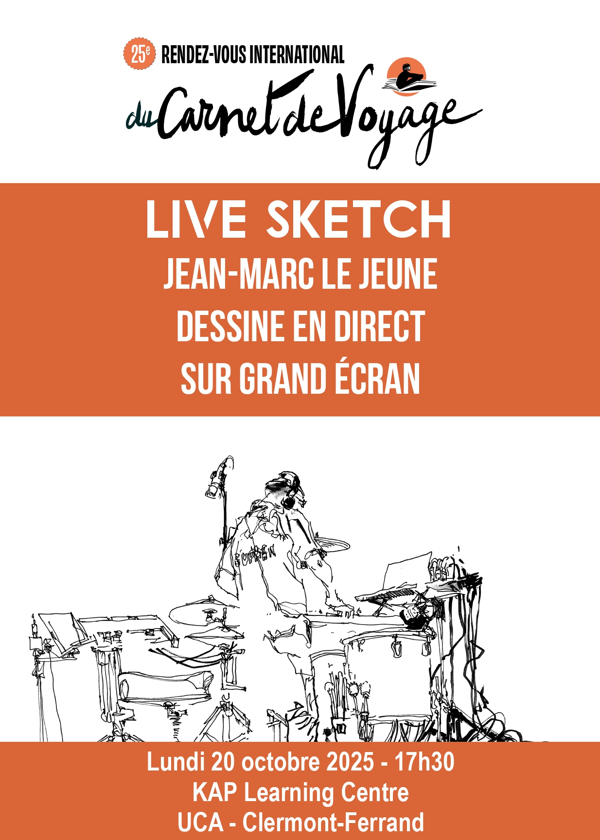 Le lundi 20 octobre 2025, en partenariat avec le Rendez-vous international du Carnet de Voyage, assistez à un "live sketch" de Jean-Marc Le Jeune qui dessinera sur grand écran, en direct du KAP !