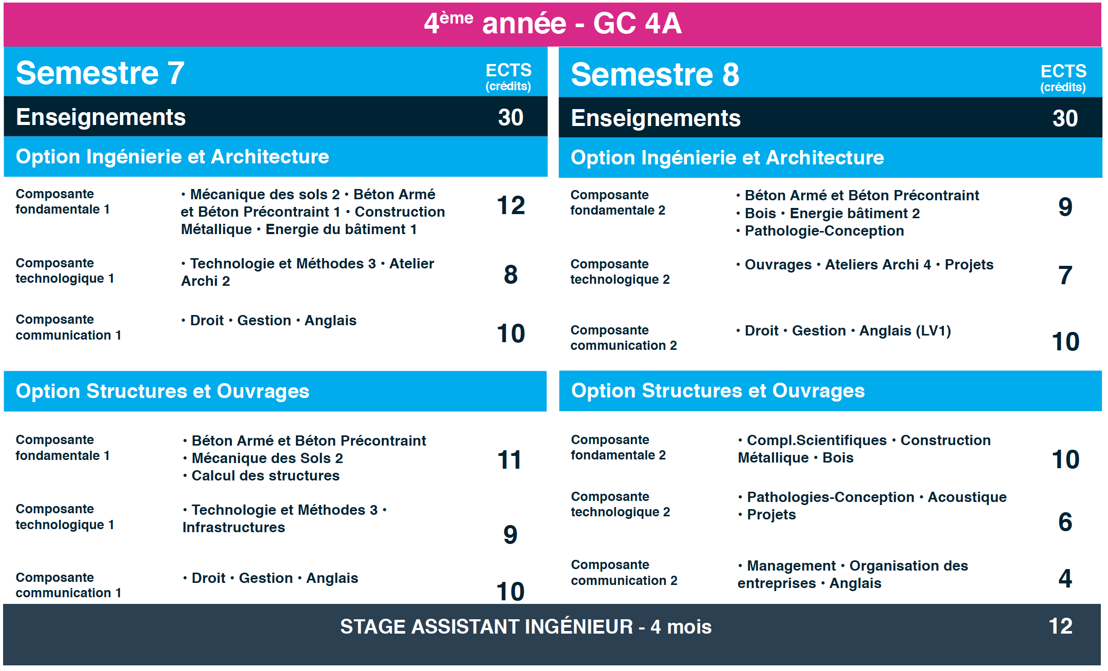 La formation d’un ingénieur en Génie Civil nécessite une approche théorique importante faisant appel aux sciences de bases comme les mathématiques, les statistiques et probabilités, la mécanique, la physique, le calcul numérique mais également une approche plus technologique comprenant des disciplines appliquées comme le béton armé, la construction métallique, la géotechnique ou l’organisation et la gestion des chantiers, les procédés généraux de construction ou encore l’architecture.