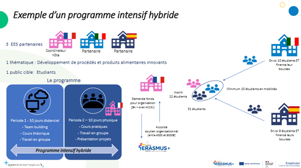 Un programme intensif hybride est une formation commune organis¨¦e entre ¨¦tablissements partenaires (3 ¨¦tablissements d¡¯enseignement sup¨¦rieur issus de 3 pays-programme Erasmus+ diff¨¦rents au minimum). Ces programmes combinent mobilit¨¦ physique et activit¨¦s virtuelles avant, pendant ou apr¨¨s le s¨¦jour dans l¡¯¨¦tablissement d¡¯accueil. L¡¯objectif de ces programmes est de d¨¦velopper des pratiques p¨¦dagogiques innovantes et transdisciplinaires.