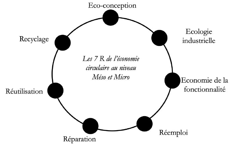 L’économie circulaire peut être définie comme un système économique d’échange et de production, qui a toutes les étapes du cycle de vie du produit (bien et service), vise à augmenter l’efficience de l’utilisation des ressources et à diminuer les impacts sur l’environnement tout en contribuant au bien-être des individus. Une transition vers l’économie circulaire implique des gains environnementaux mais également des réallocations sectorielles de ressources entre les activités intensives en matières et en énergie, et celles qui contribuent au respect de l’environnement. Depuis quelques années, sous l’impulsion de l’ADEME, l’économie circulaire renvoie à trois domaines d’actions (la production, la consommation et la gestion des déchets) et à sept grands principes (les achats responsables, l’écoconception, l’écologie industrielle, l’économie de la fonctionnalité, la consommation responsable, l’allongement de la durée d’usage et le recyclage).