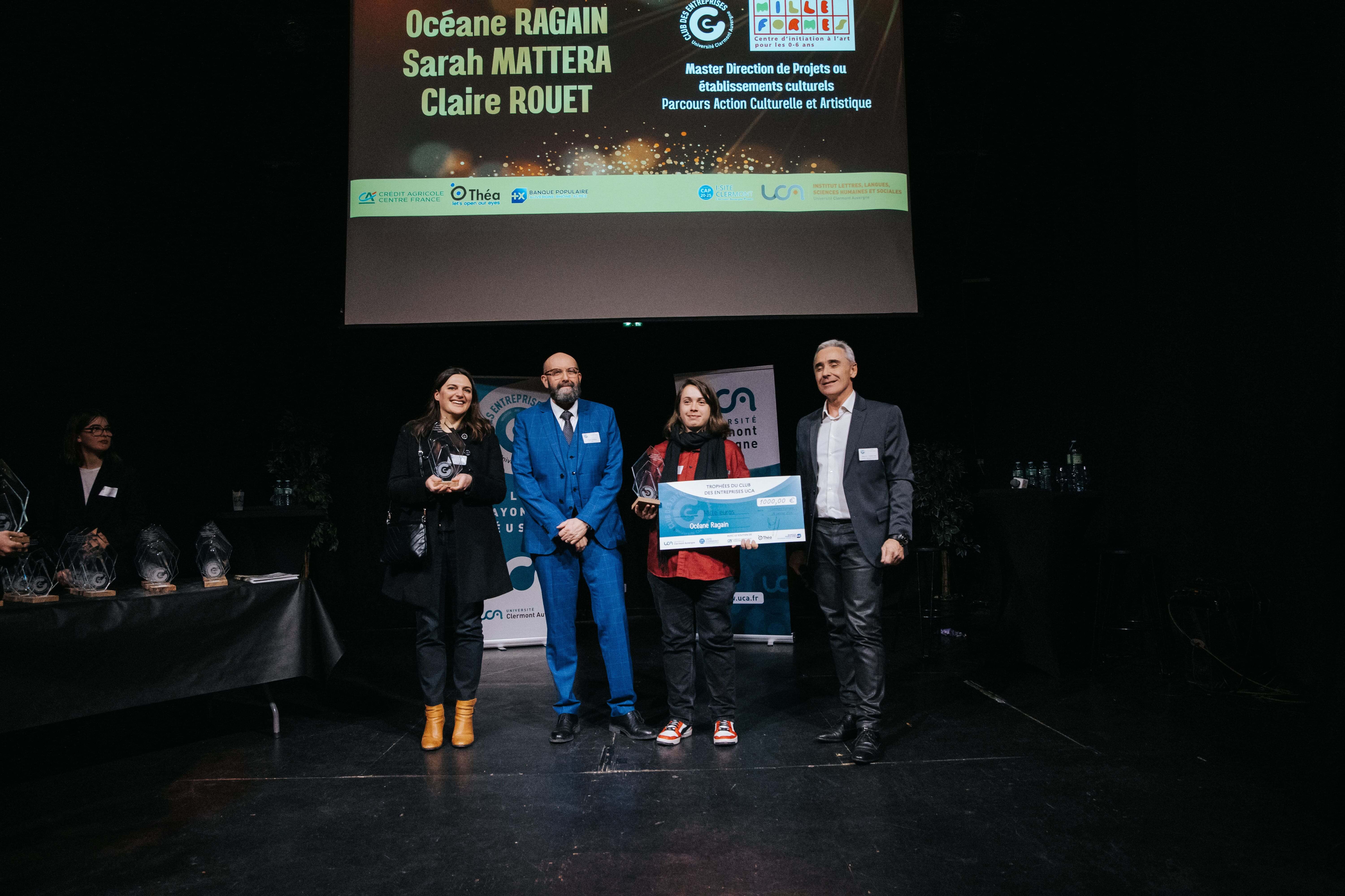 Prix remis par Emmanuel CHARRITTON du Crédit Agricole Centre France (sponsor) à l'étudiante Océane RAGAIN (étudiante en Master Direction de projets ou établissements culturels parcours Action culturelle et artistique), son enseignante Claire ROUET, et ses tutrices entreprise Sarah MATTERA et Violaine MOREAU pour le projet de stage au sein de Mille Formes, Centre d'initiation à l'art porté par la Ville de Clermont-Ferrand.