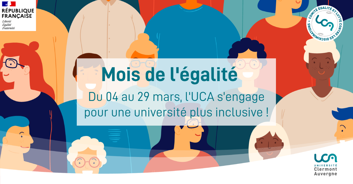 Afin de mettre à l’honneur l’égalité et affirmer l’engagement de l’UCA pour une meilleure inclusion, tous les sites de l’université accueilleront une multitude d’animations du 04 au 29 mars, gratuites et ouvertes à toute la communauté étudiante ainsi qu’aux personnels. Ce mois de l’égalité a pour objectif de sensibiliser l’ensemble de l’UCA aux discriminations de tout genre.