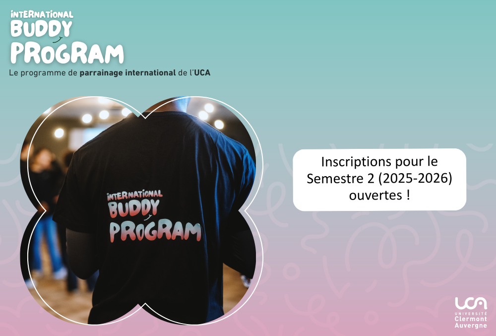 Dispositif de l'Université Clermont Auvergne, le Buddy Program International permet de mettre en relation un étudiant/doctorant international récemment inscrit, et un étudiant/doctorant de l’UCA souhaitant l’accompagner dans sa découverte de l’université et de la vie étudiante.