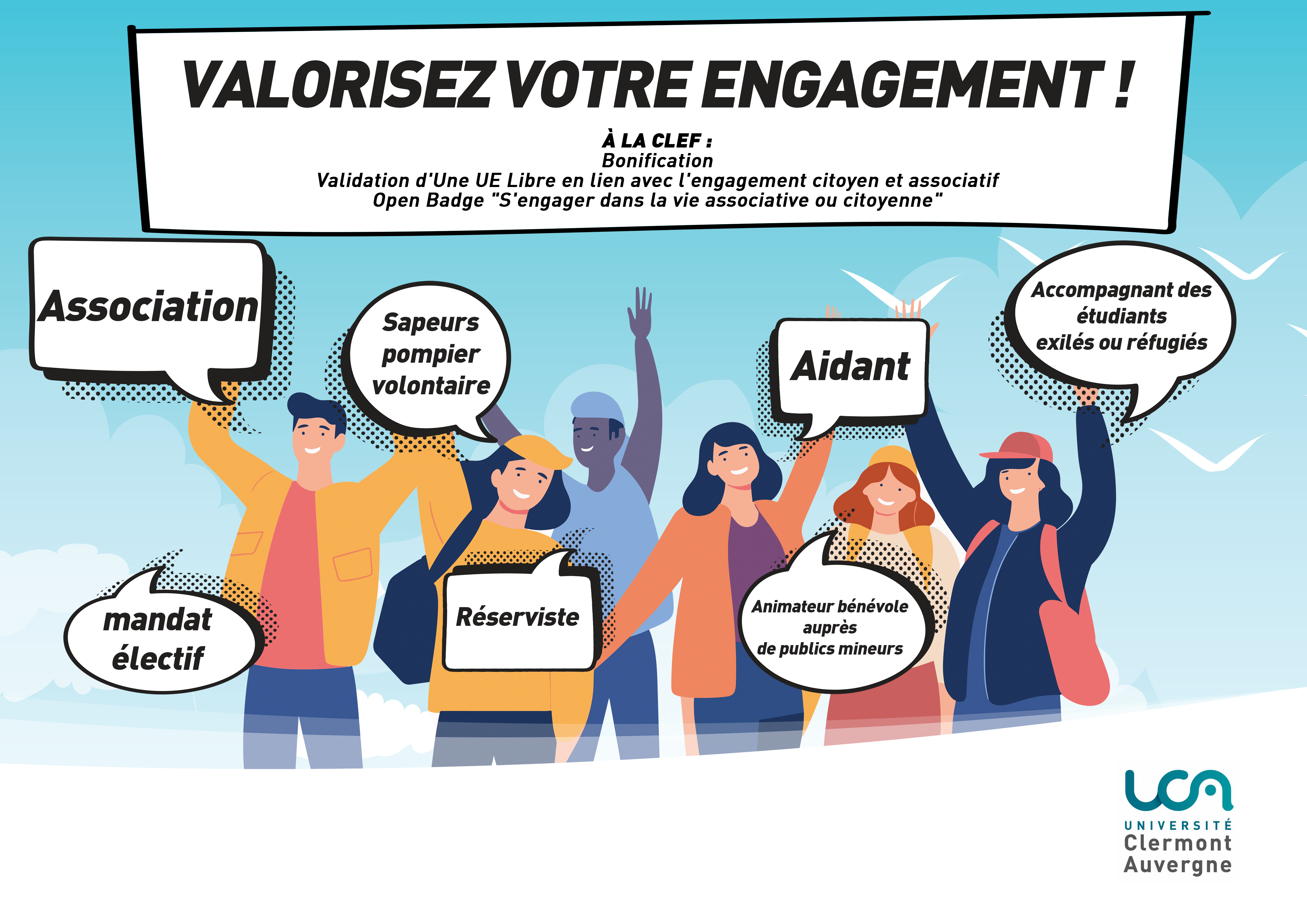 L’UCA propose des dispositifs de valorisation de l’engagement étudiant. Engagé dans le bureau d’une association, dans une mission de service civique, proche aidant, dans un mandat électif au sein des conseils de l’UCA ou du Crous Clermont Auvergne ?