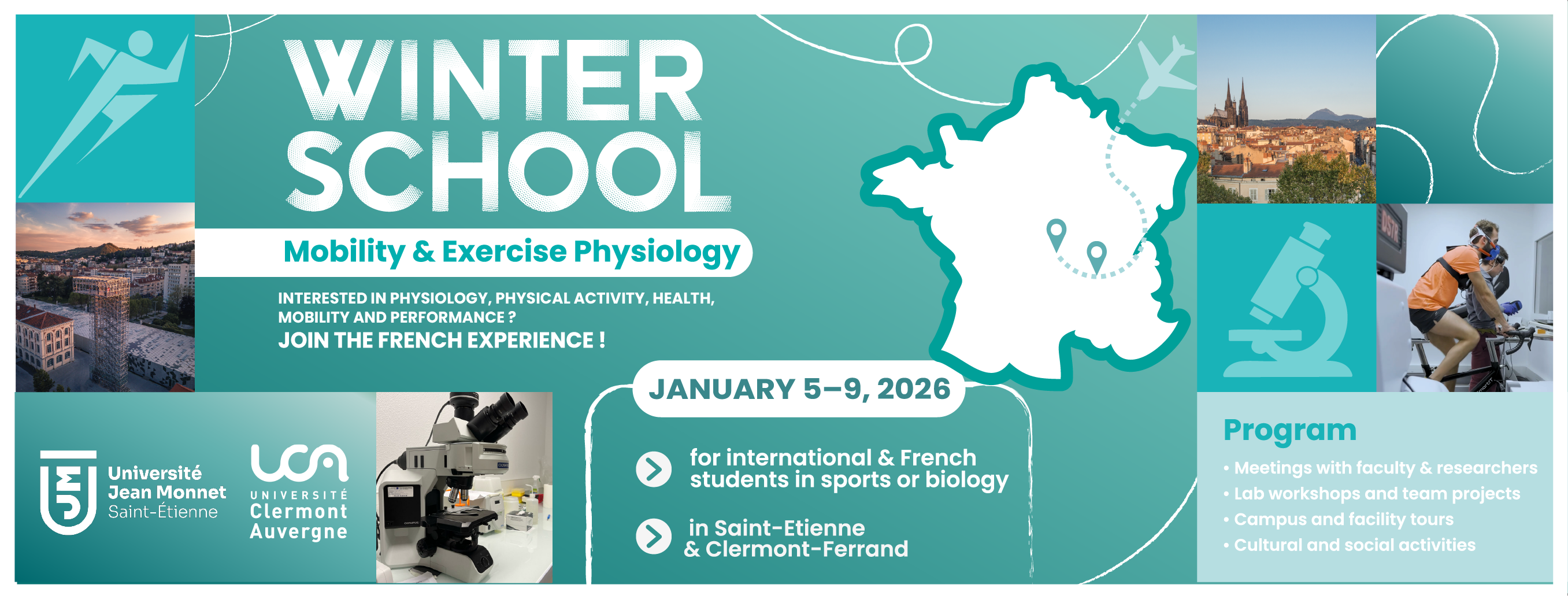 Rejoignez-nous pour la Mobility & Exercise Physiology Winter School, une opportunité académique unique entièrement en anglais, ouverte aux étudiants fran?ais et internationaux ayant un intérêt marqué pour la performance , la mobilité et la santé.